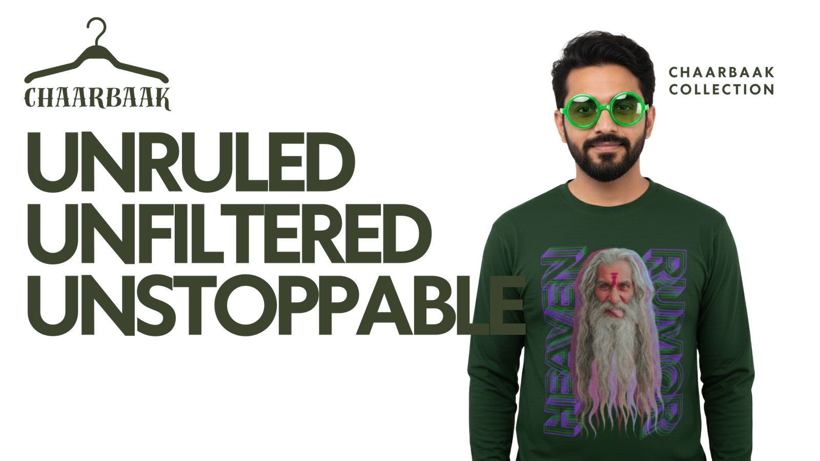 Chaarbaak is proudly an Indian brand, rooted in Indian realities, emotions, struggles, and spirit. Our designs speak to the Indian mindset—unfiltered, fearless, and unapologetic. We create for those who think independently and wear their beliefs without hesitation.
