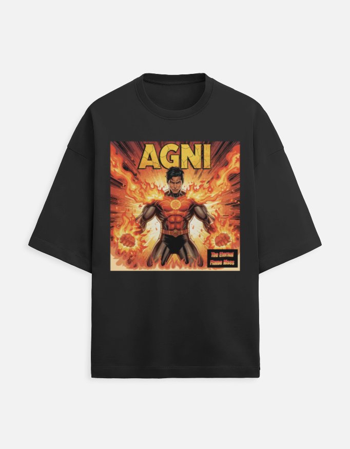 A powerful oversized T-shirt depicting Agni, the Hindu element of fire, reimagined as a modern superhero. Radiating energy, transformation, and unstoppable force, the artwork blends ancient elemental philosophy with contemporary hero aesthetics. Bold and dynamic, this design celebrates inner fire, courage, and the power to transform.