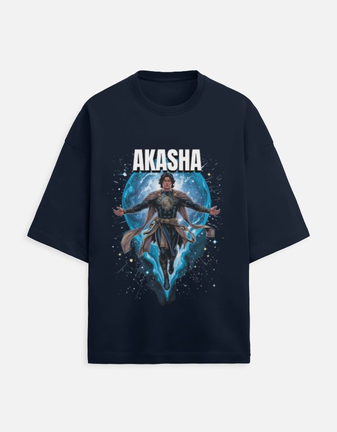 A striking oversized T-shirt featuring Akasha, the Hindu element of Space/Ether, reimagined as a modern superhero. Ethereal, infinite, and all-encompassing, Akasha embodies consciousness, connection, and the unseen forces that bind the universe. The artwork blends ancient elemental philosophy with contemporary superhero style, celebrating the power of awareness, expansiveness, and limitless potential.