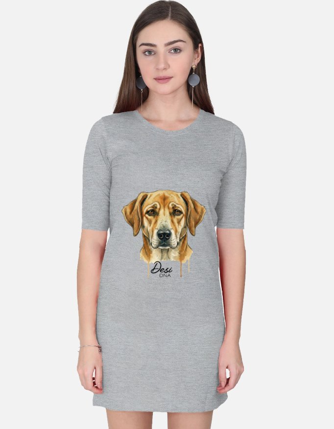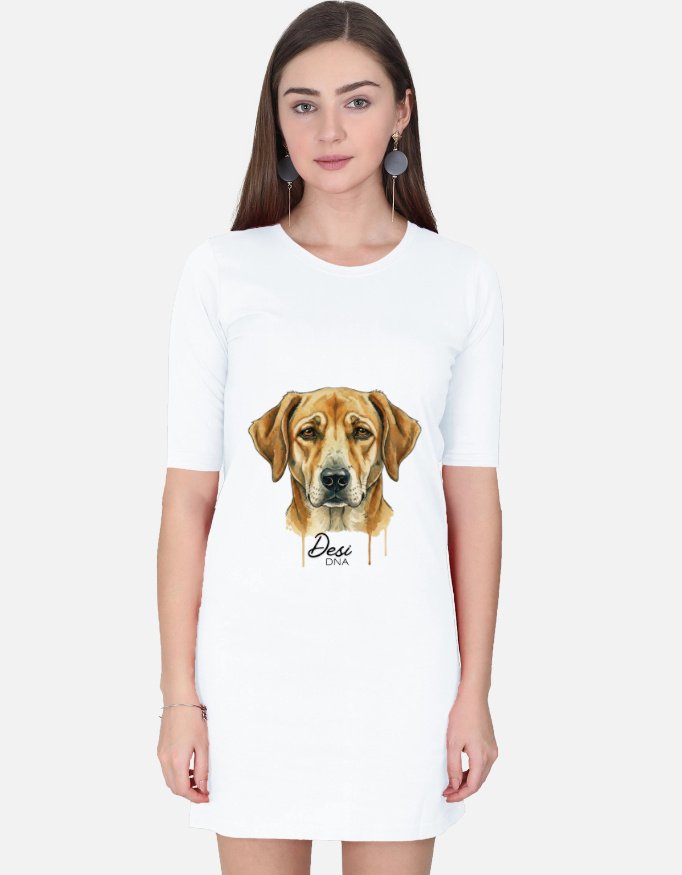 Redefine casual elegance with the Chaarbaak “Desi DNA” T-Shirt Dress, a piece that combines the effortless comfort of a staple tee with a bold, artistic silhouette. This mid-length dress serves as a canvas for the signature soulful Desi dog illustration, featuring warm golden tones and modern “drip” paint details that celebrate the resilient spirit of our local legends. The “Desi DNA” calligraphy anchored below the graphic makes a proud statement of identity and heritage. Designed with a relaxed, oversized fit and an extended hem, this dress offers a breezy, street-ready look that transitions perfectly from a morning coffee run to an evening out.
