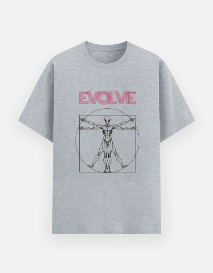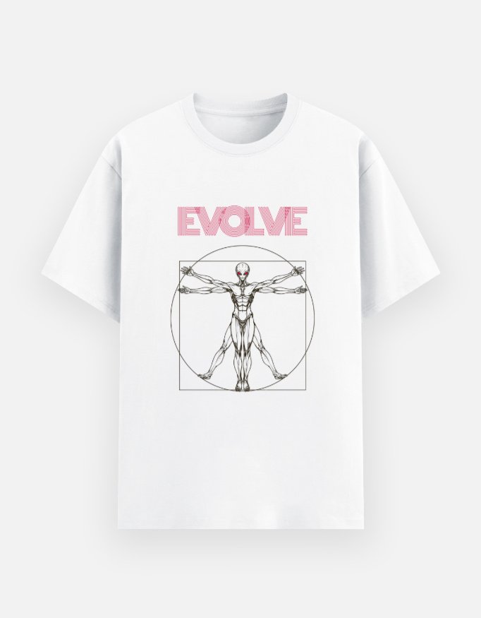 The Chaarbaak design philosophy for the “Evolve” tee explores the intersection of classical humanism and a speculative future. By reimagining Da Vinci’s Vitruvian Man through an extraterrestrial lens, this piece challenges our anthropocentric view of progress and perfection. The juxtaposition of the traditional geometric square and circle with a sleek, alien silhouette suggests a new stage of biological or cosmic evolution, while the soft pink “EVOLVE” typography introduces a glitch-like, digital aesthetic that softens the starkness of the scientific diagram. Set against a clean white canvas, the design emphasizes clarity and intellectual curiosity, making it a staple for those who look toward the stars and question the limits of the human form.