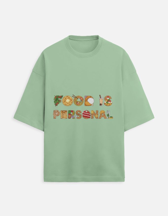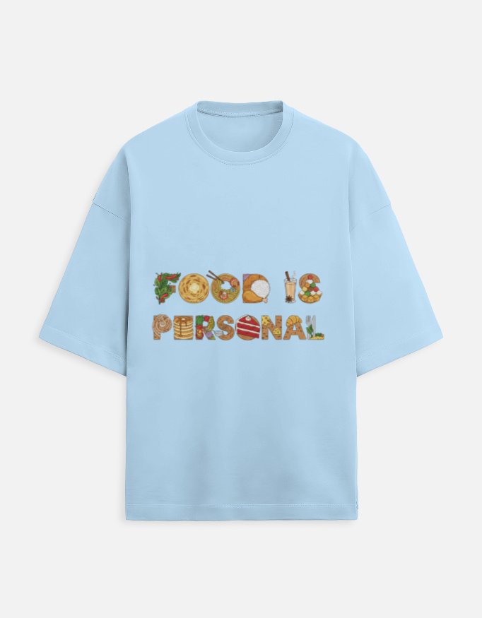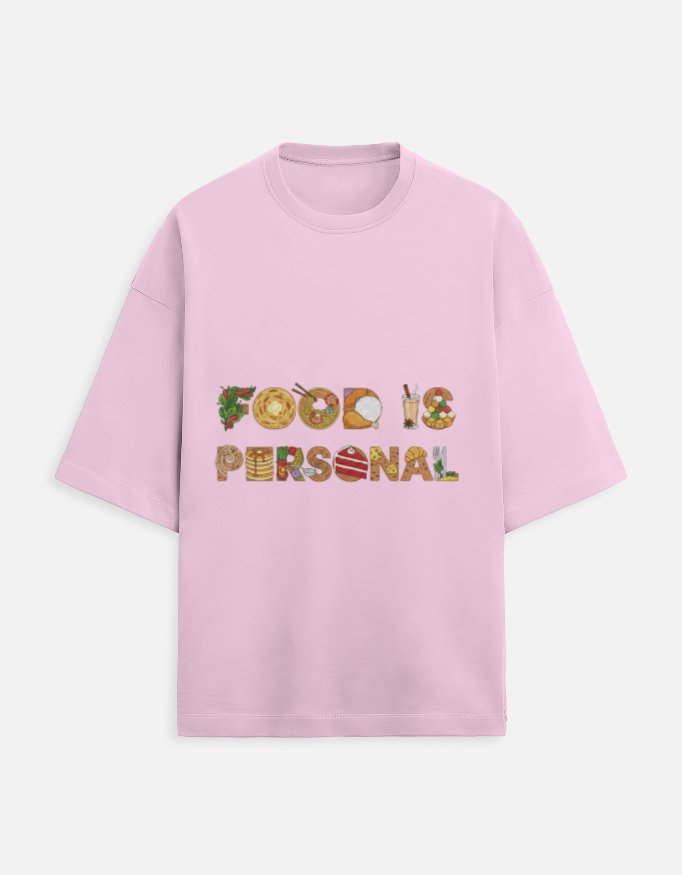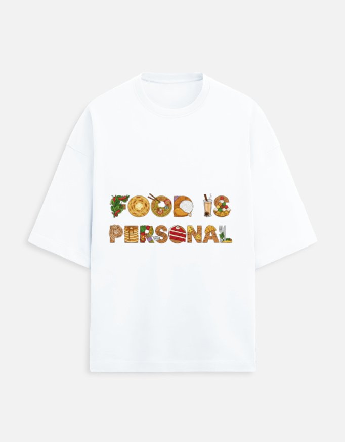 This tee features the statement “Food Is Personal” filled with intricate illustrations of your everyday favorites — fruits, snacks, spices, street eats, and home-cooked staples woven right into the letters. Every detail hits different, just like every plate tells a story.