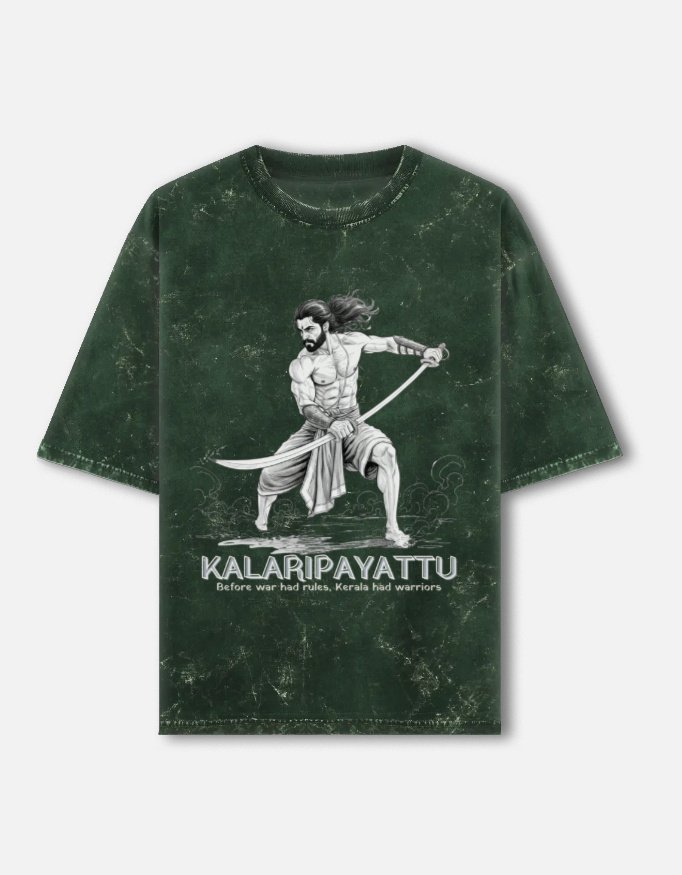 This oversized acid wash T-shirt from Chaarbaak pays homage to Kalaripayattu, one of the world’s oldest martial arts. The design captures the raw power, discipline, and fluid movement of the ancient art form—reimagined through a modern streetwear lens. Each acid wash finish gives the tee a rugged, lived-in character, making every piece uniquely its own.