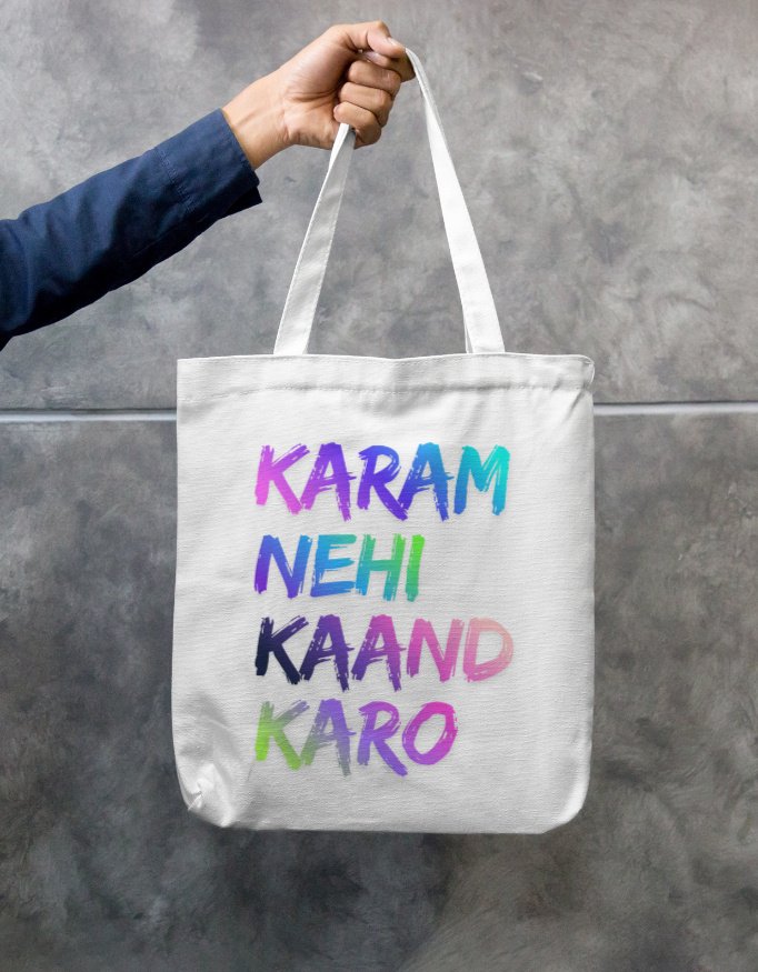 + Free ShippingThe design philosophy of this tote is an exercise in vibrant defiance, using high-energy, neon brushwork to turn a simple utility item into a loud cultural statement. By featuring the bold, multi-colored phrase “KARAM NEHI KAAND KARO,” the bag connects with the emotion of fearless spontaneity—the drive to stop waiting for destiny and start creating your own chaotic, beautiful reality. Set against a clean, off-white canvas, the raw texture of the typography mirrors the unfiltered nature of the message itself. It is a piece designed for the modern trailblazer who carries their world with them and isn’t afraid to let everyone know they’re here to make an impact, not just a living.