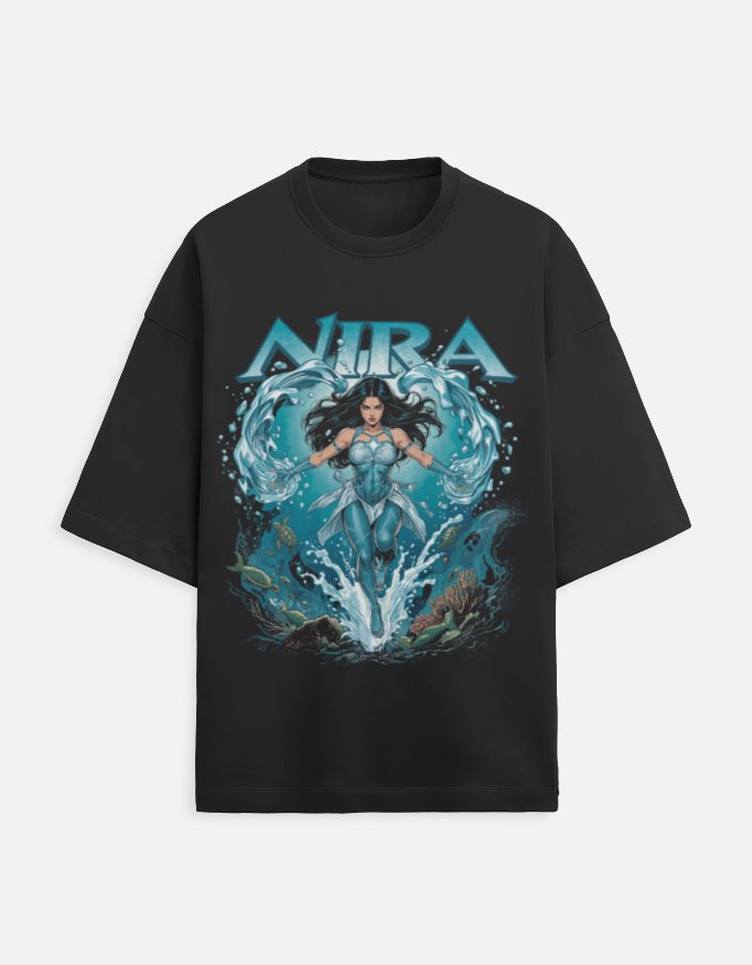 An oversized T-shirt featuring Nira, a female superhero embodying Jala (Water), one of the Hindu elements. Flowing, adaptable, and powerful, she represents life, purity, and transformation. The artwork merges ancient elemental philosophy with modern superhero aesthetics, celebrating feminine strength, resilience, and the fluid force of nature.