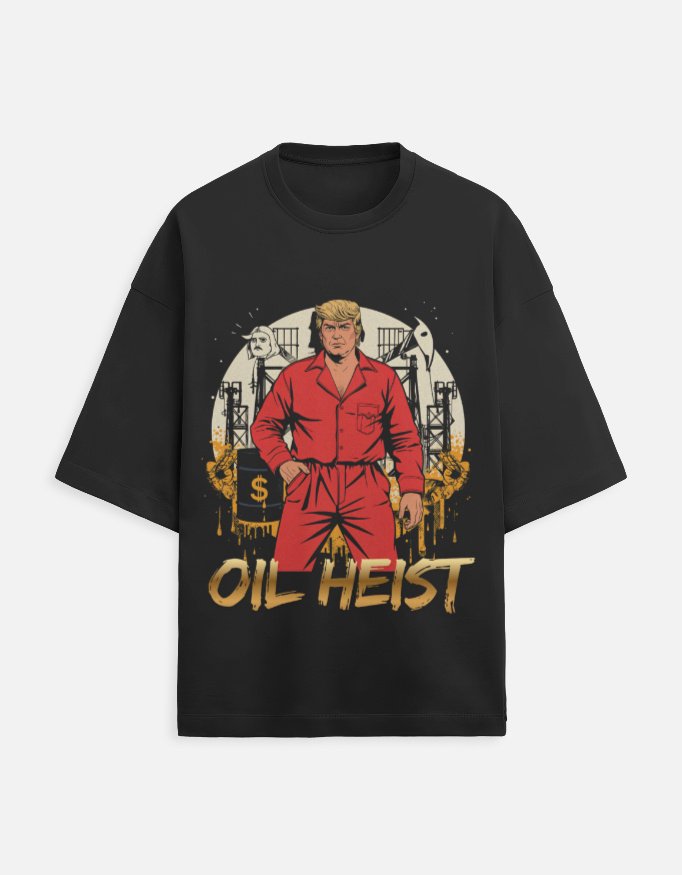 A bold oversized T-shirt featuring the text “Oil Heist” alongside a satirical illustration of Donald Trump dressed in Money Heist–style attire, standing in front of an oil rig. The design delivers a playful yet provocative commentary on power, greed, and resource exploitation, blending pop culture and political satire in one striking piece.