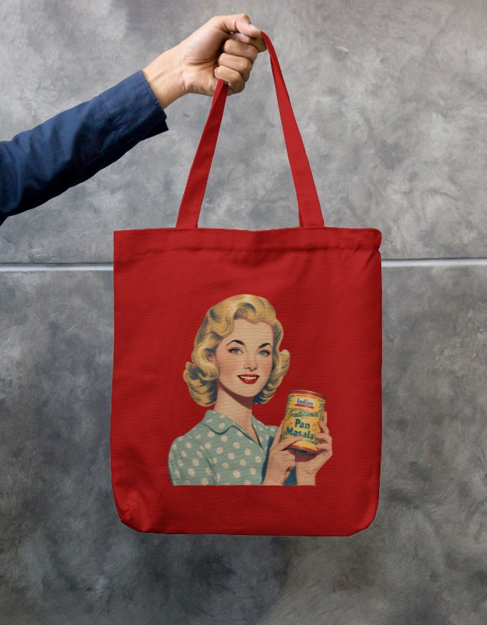 + Free ShippingThis tote bag features a striking illustration inspired by 1930s American advertisement posters, depicting a blonde woman styled as a vintage brand ambassador for pan masala. The artwork is a critical commentary on how capitalist advertising has historically used women’s imagery to glamorize and normalize harmful substances. Bold, ironic, and visually nostalgic, the design challenges viewers to reflect on manipulation in marketing while celebrating retro commercial art aesthetics.