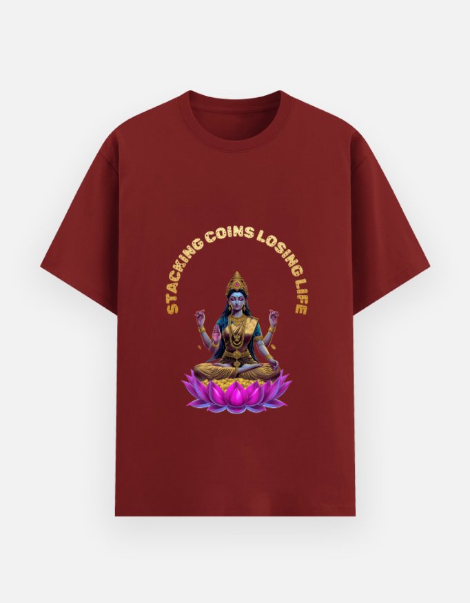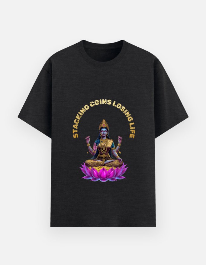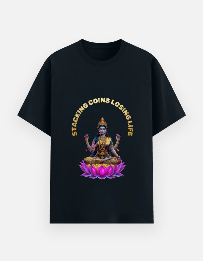 Gold glitters, but it doesn’t breathe. Our “Stacking Coins, Losing Life” tee is a visual critique of the modern obsession with wealth over well-being. This design features a reimagined, ethereal figure seated upon a lotus, surrounded by a golden aura of prosperity—yet the message above is a stark reminder of the hidden cost of the hustle.