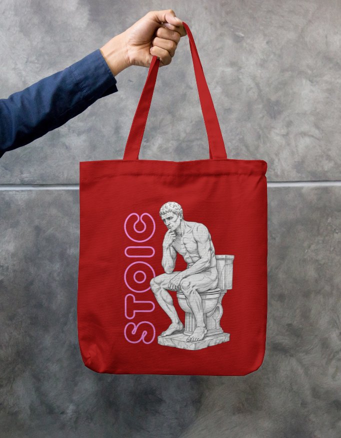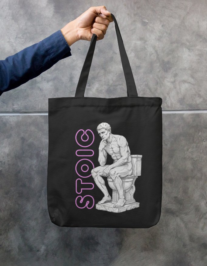 The design philosophy of this tote bag is rooted in subversive realism, merging the grandeur of classical philosophy with the unapologetic honesty of everyday life. By placing the iconic “Thinker” in a mundane, private setting, the design connects with the emotion of authentic contemplation—the realization that our most profound insights often happen in the most ordinary moments. The stark white line art contrasts beautifully with the deep forest green canvas and the bold, neon-pink “STOIC” typography, creating a visual that is both intellectually sharp and irreverently modern. This is more than a carryall; it is a statement piece for those who find wisdom in the physical world and value the truth of the human experience over polished illusions.