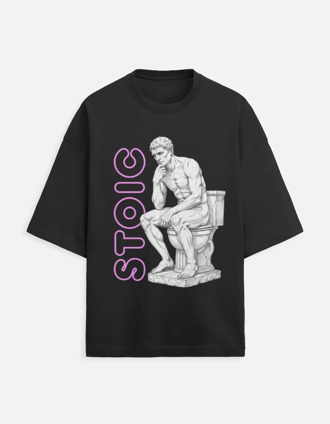 The design philosophy of this piece is rooted in grounded irony, using a sharp, satirical lens to humanize high-minded philosophy. By placing a classical “Thinker” statue in a mundanely human setting, the design connects with the emotion of authentic vulnerability—the idea that wisdom isn’t found in a temple, but in the quiet, unglamorous moments of our actual lives. The contrast of the detailed white line art against the bold, neon-pink “STOIC” typography creates a visual tension that is both intellectually provocative and street-ready. This tee is for the realist who appreciates ancient wisdom but refuses to take themselves too seriously, perfectly embodying the Chaarbaak belief that the physical world, in all its messy reality, is the only one that truly matters.